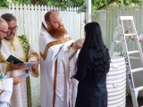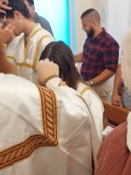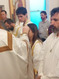 After the conclusion of the eight Prophecy Readings, eight adults and one infant were successively anointed with ‘the oil of gladness’, thrice-immersed in the baptismal waters, robed in white, and anointed with Chrism. Later, they were the first to receive Communion – their third sacrament of this unique day. The godparents began their lifelong role by assisting their respective godchildren – particularly at the font, when being robed, when receiving Communion, and at the baptismal tonsure.